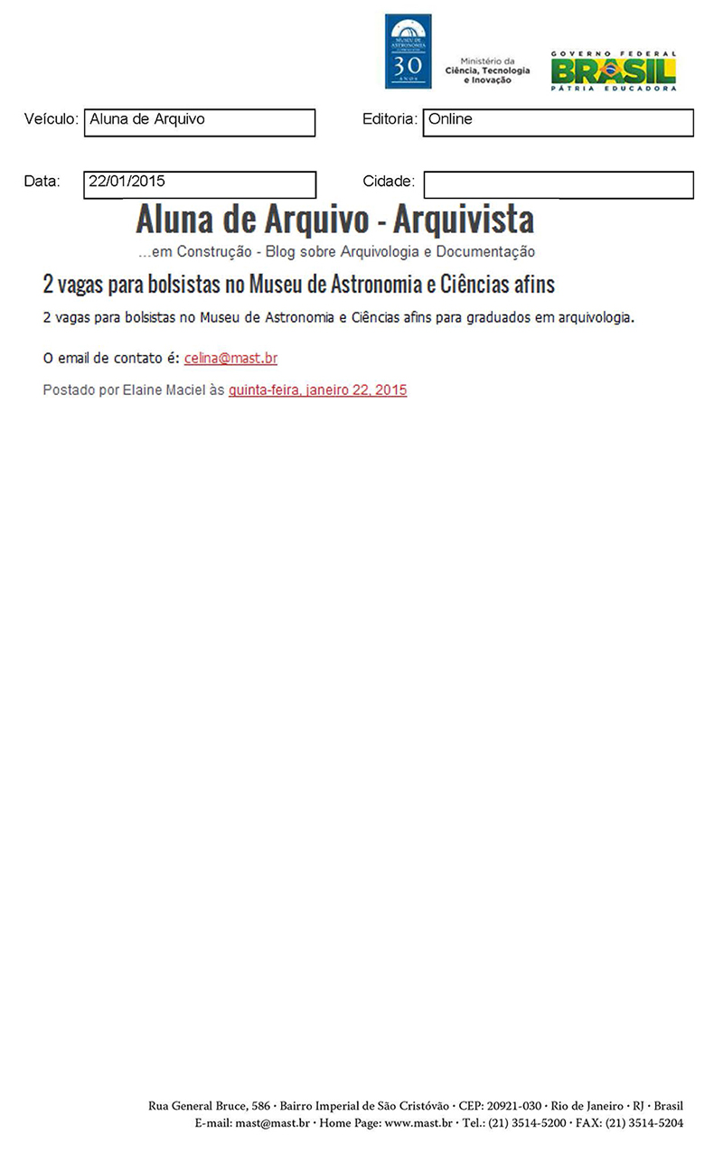 Aluna de Arquivo | 2 vagas para bolsistas no Museu de Astronomia e Ciências Afins