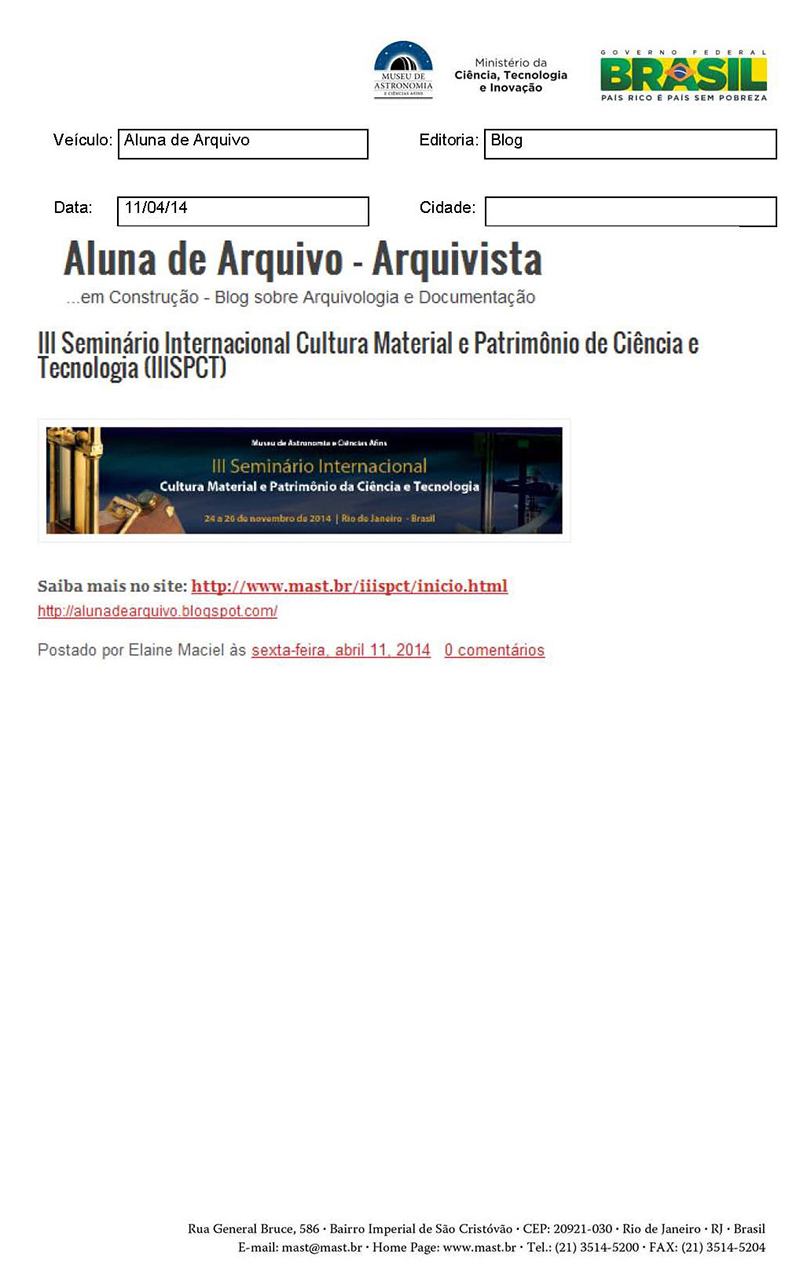 Aluna de Arquivo | III Seminário Internacional Cultura Material e Patrimônio de Ciência e Tecnologia (IIISPCT)