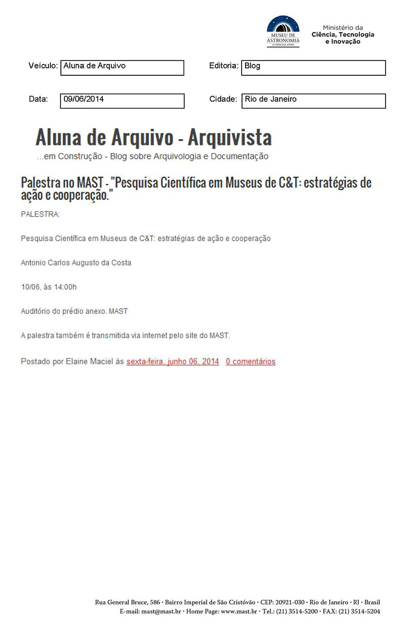 Aluna de Arquivo | Palestra no MAST - "Pesquisa Científica em Museus de C&T: estratégias de ação e cooperação"