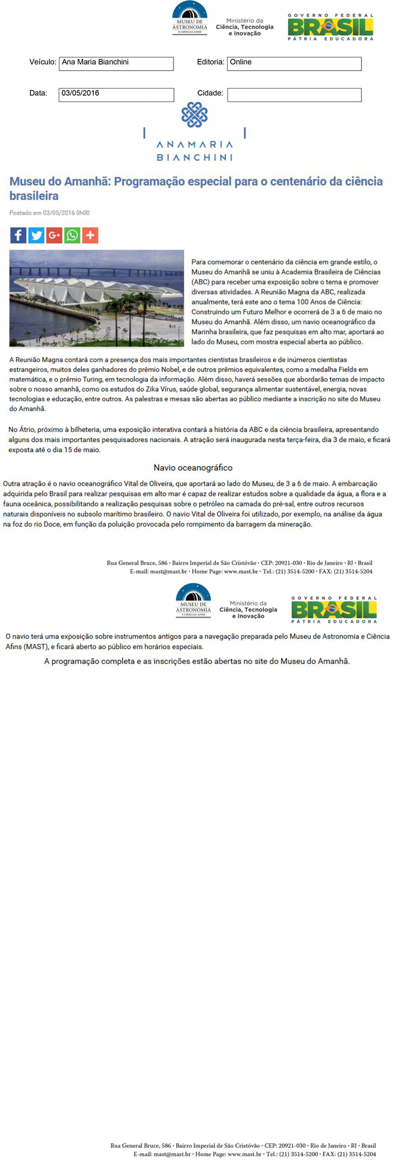 Ana Maria Bianchini | Museu de Amanhã: Programação especial para o centenério da ciência brasileira
