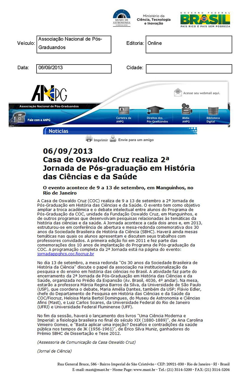 Associação Nacional de pós-graduandos | Casa de Oswaldo Cruz realiza 2ª Jornada de Pós-graduação em História das Ciências e da Saúde