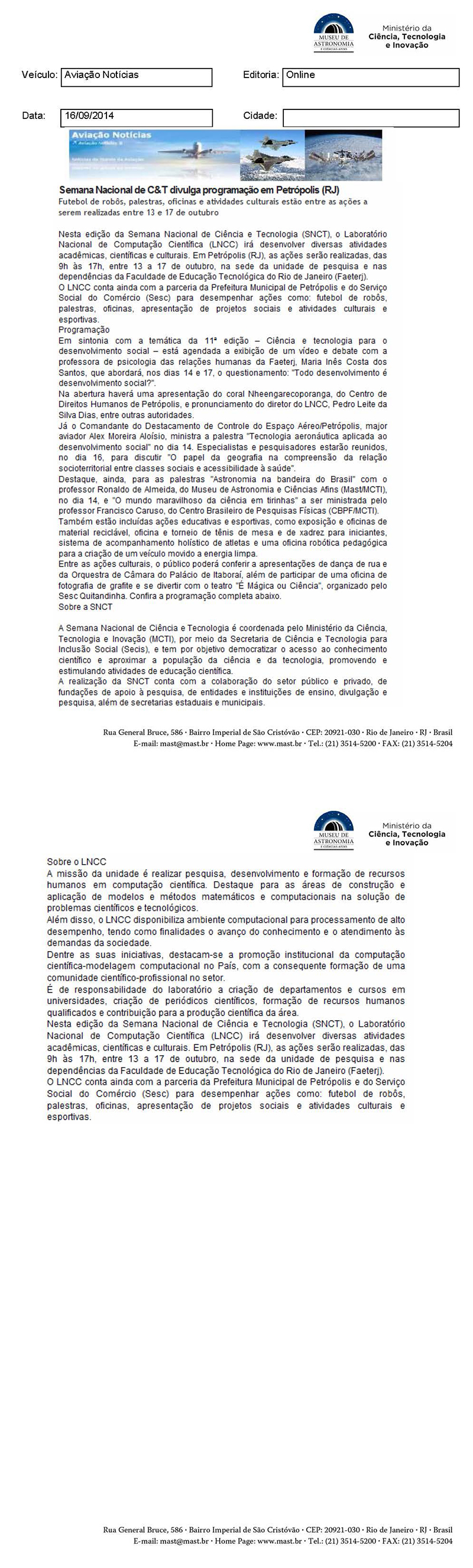 Aviação Notícias | Semana Nacional de C&T divulga programação em Petrópolis (RJ)