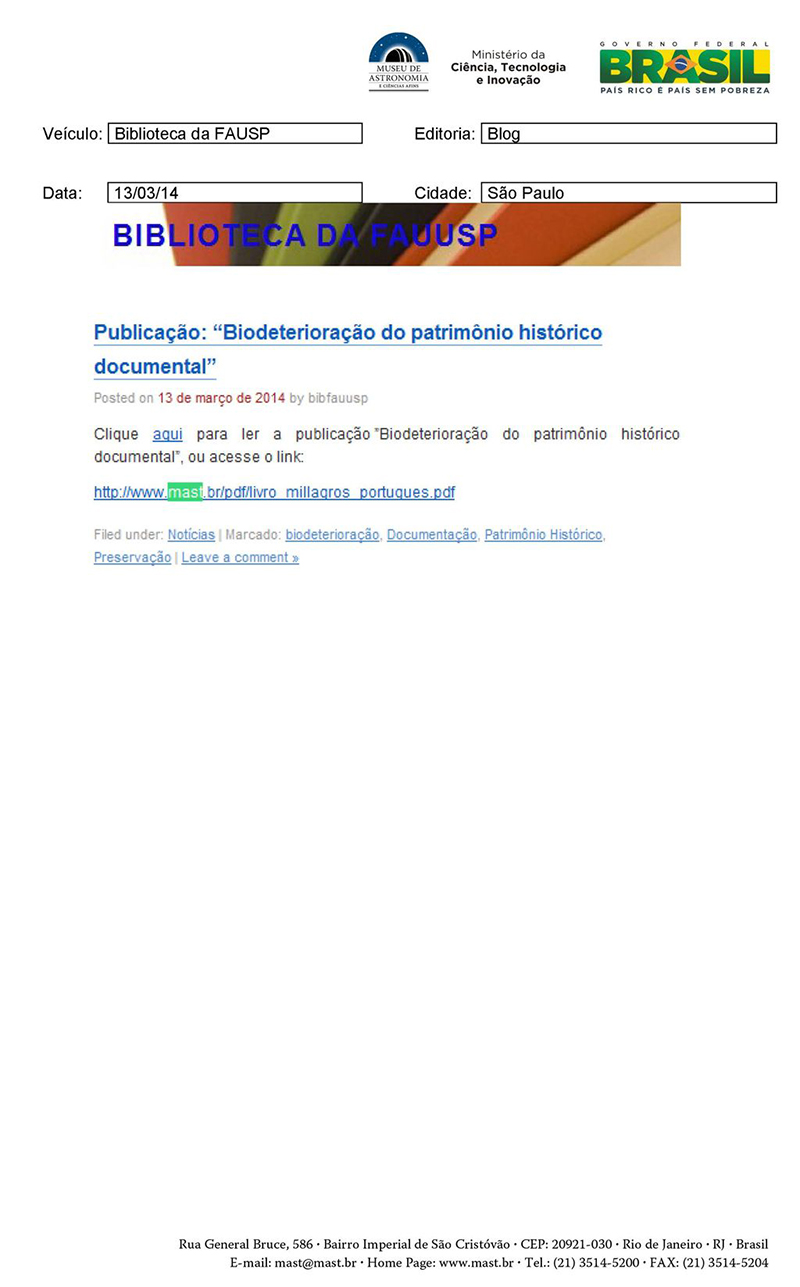 Biblioteca da FAUSP | Publicação: "Biodeterioração do patrimônio histórico documental"