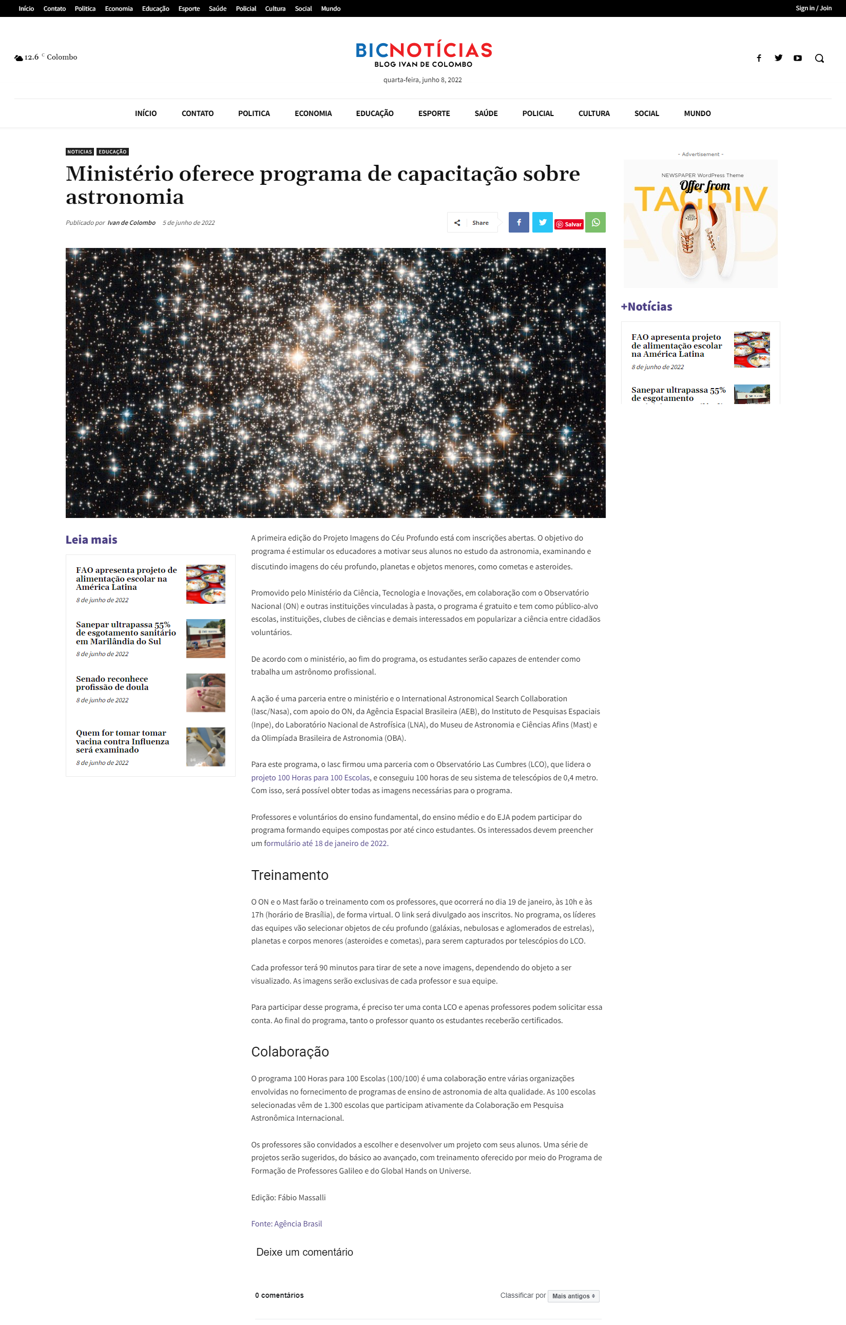BIC Notícias - MAST na reportagem 'Ministério oferece programa de capacitação sobre astronomia'