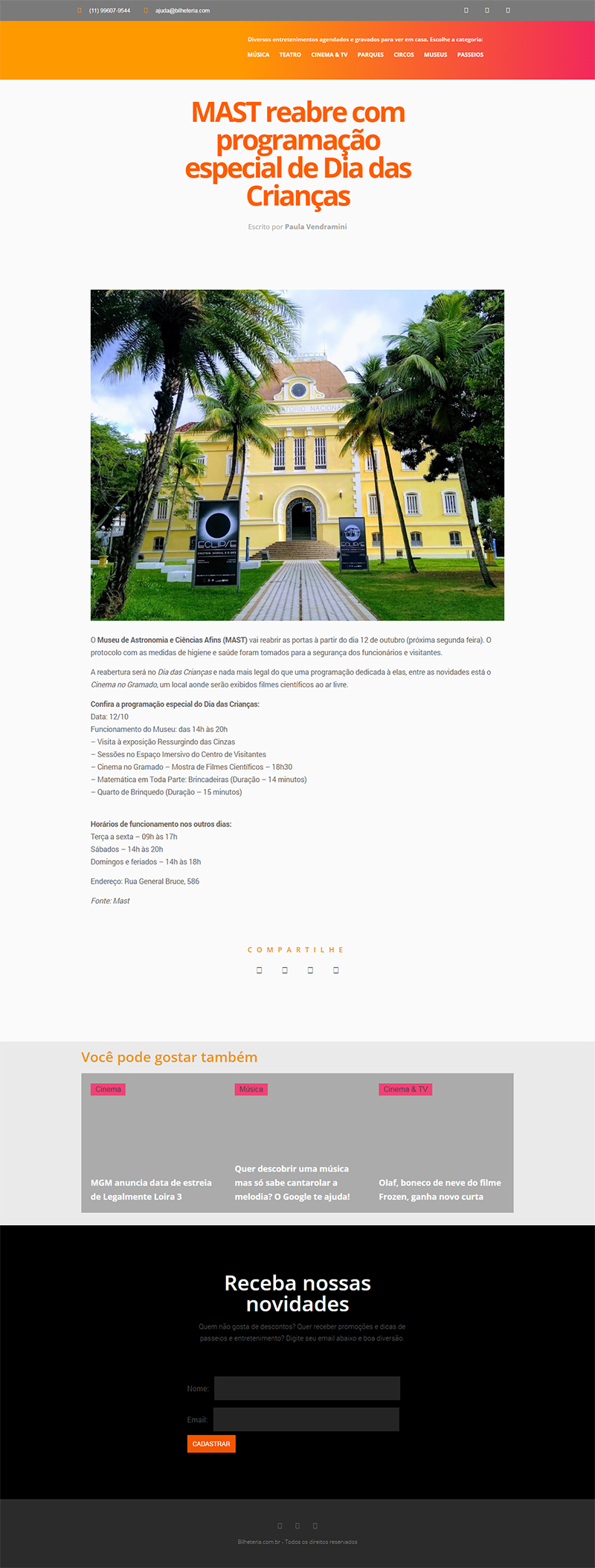 Bilheteria News (blogue) | Museu de Astronomia e Ciências reabre com programação para o Dia das Crianças