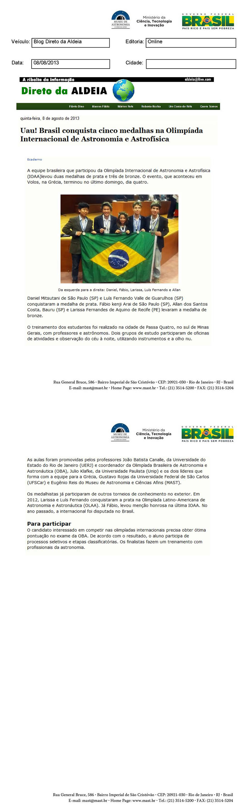 Blog Direto da Aldeia | Uau! Brasil conquista cinco medalhas na Olimpíada Internacional de Astronomia e Astrofísica