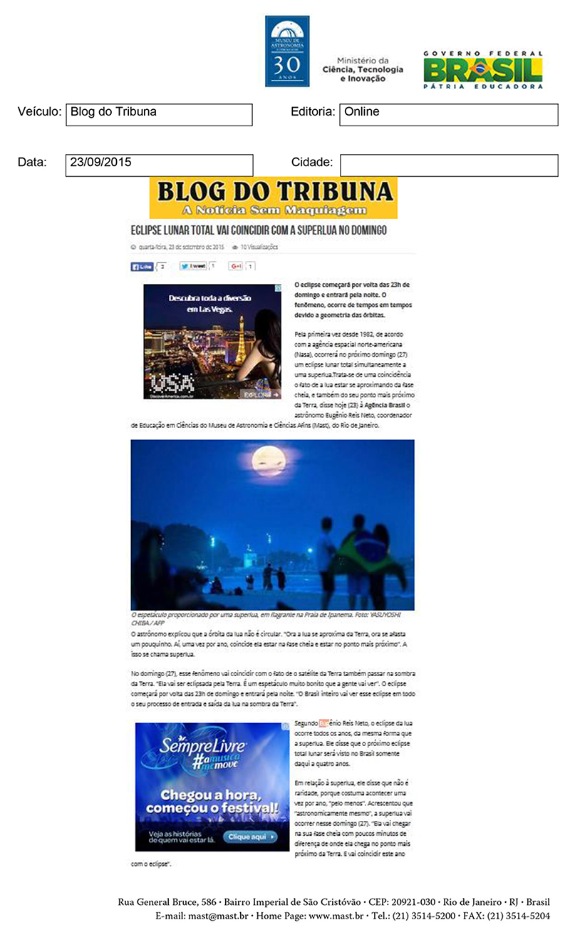 Blog do Tribuna | Eclipse lunar total vai coincidir com a superlua no domingo