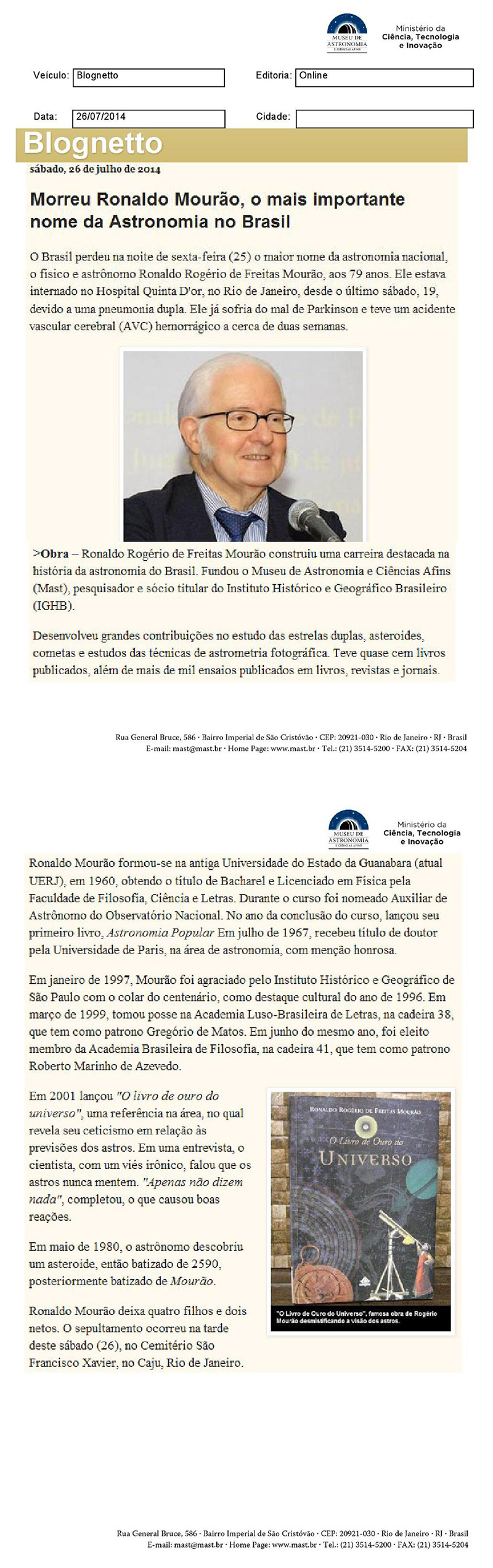 Blognetto | Morreu Ronaldo Mourão, o mais importante nome da Astronomia no Brasil