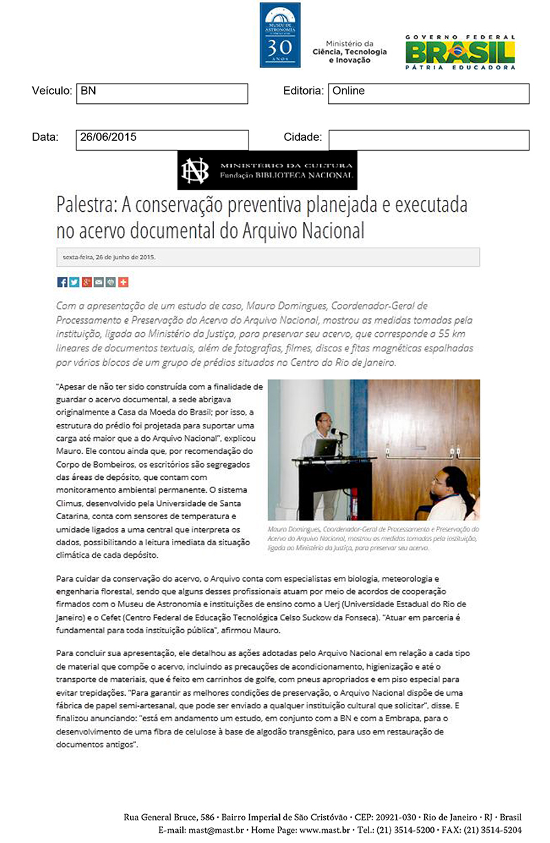 BN | Palestra: A conservação preventiva planejada e executada no acervo documental do Arquivo Nacional
