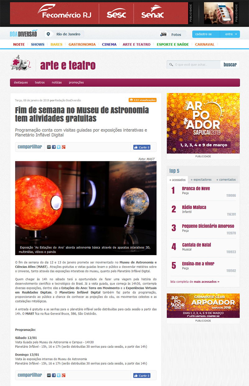 Boa Diversão - arte e teatro | Fim de semana no Museu de Astronomia tem atividades gratuitas