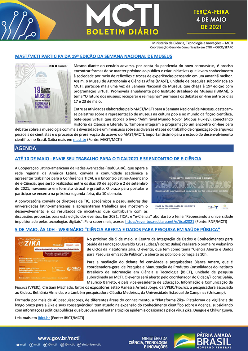 Boletim Diário MCTI | MAST participa da 19ª Edição da Semana Nacional de Museus
