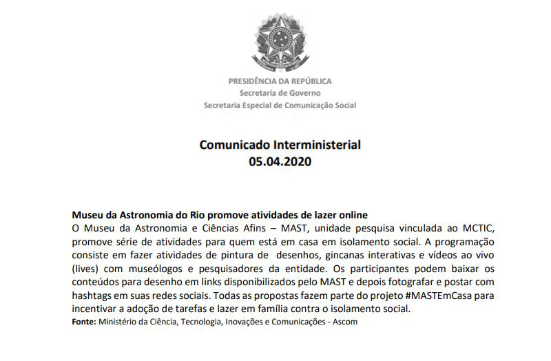 Boletim Interministerial / Presidência da República – Palácio do Planalto (institucional) | MAST disponibiliza visita virtual e lives com pesquisadores