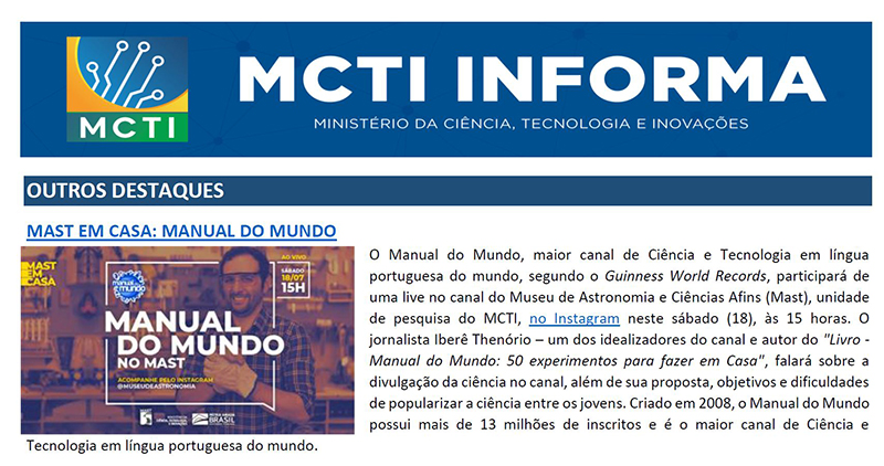 Boletim MCTI Informa | MAST Em Casa vai apresentar live com Iberê Thenório, do canal Manual do Mundo