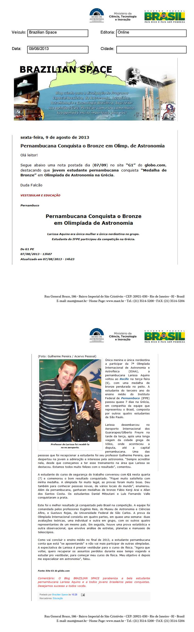 Brazilian Space | Pernambucana conquista o bronze em Olimpíada de Astronomia