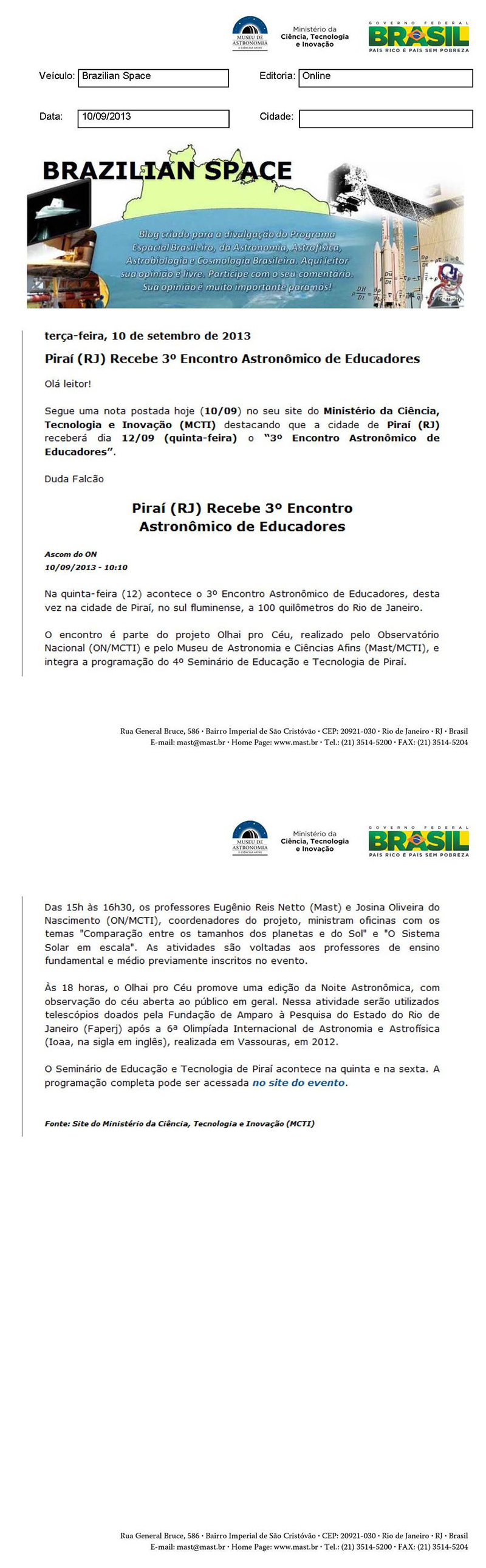 Brazilian Space | Piraí (RJ) recebe 3º Encontro Astronômico de Educadores