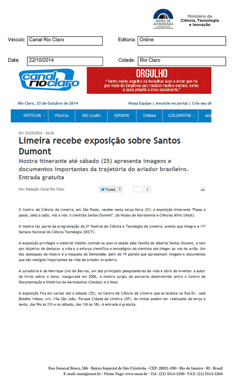Canal Rio Claro | Limeira recebe exposição do MAST sobre Santos-Dumont