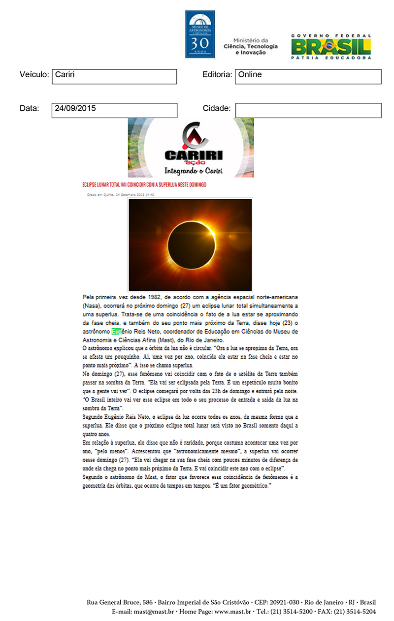 Cariri | Eclipse lunar vai coincidir com a superlua neste domingo