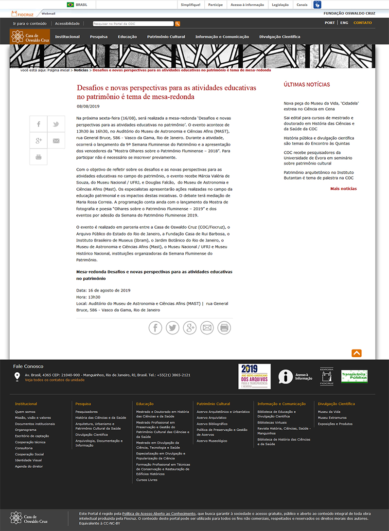 Casa de Oswaldo Cruz | Desafios e novas perspectivas para as atividades educativas no patrimônio é tema de mesa-redonda