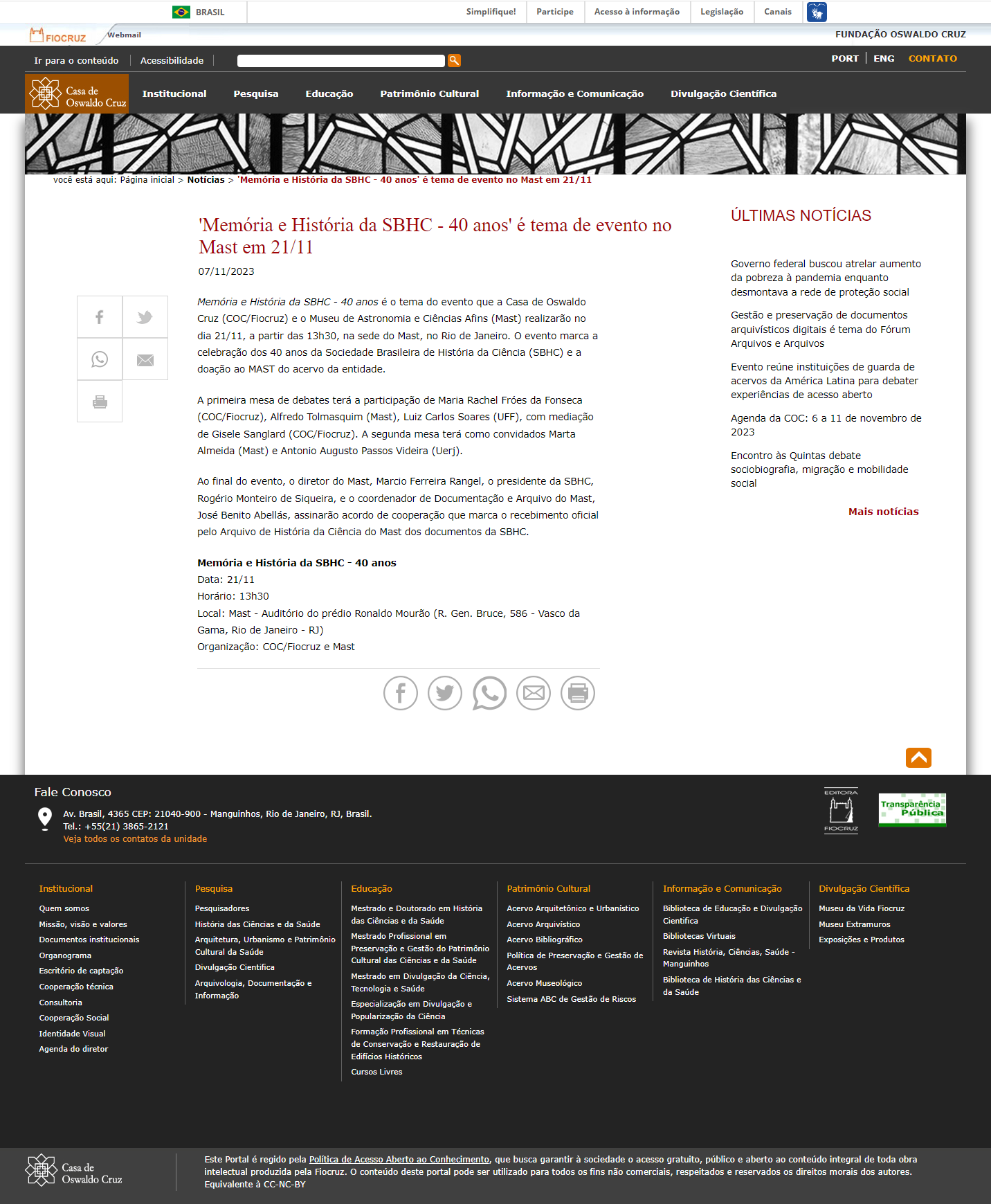 Casa de Oswaldo Cruz - 'Memória e História da SBHC - 40 anos' é tema de evento no Mast em 21/11