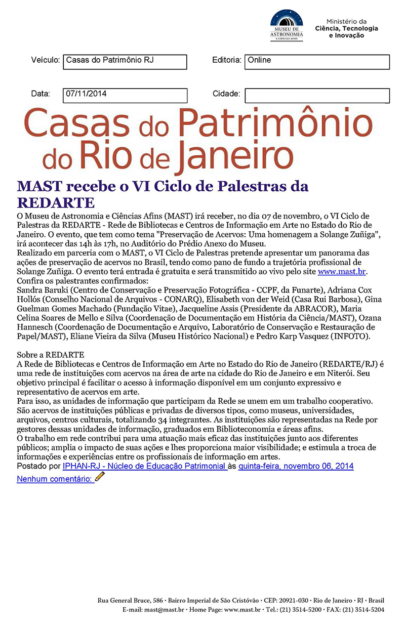 Casas do Patrimônio RJ | MAST recebe o VI Ciclo de Palestras da REDARTE