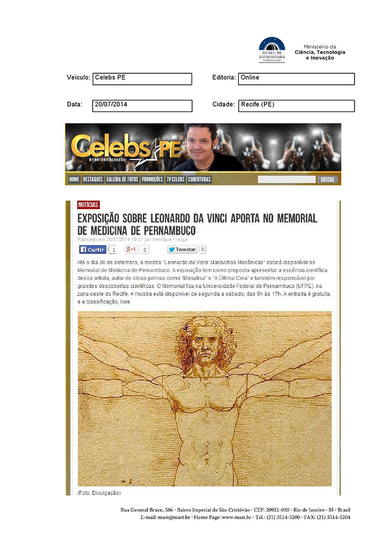 Celebs CE | Exposição sobre Leonardo da Vinci aporta no Memorial de Medicina de Pernambuco