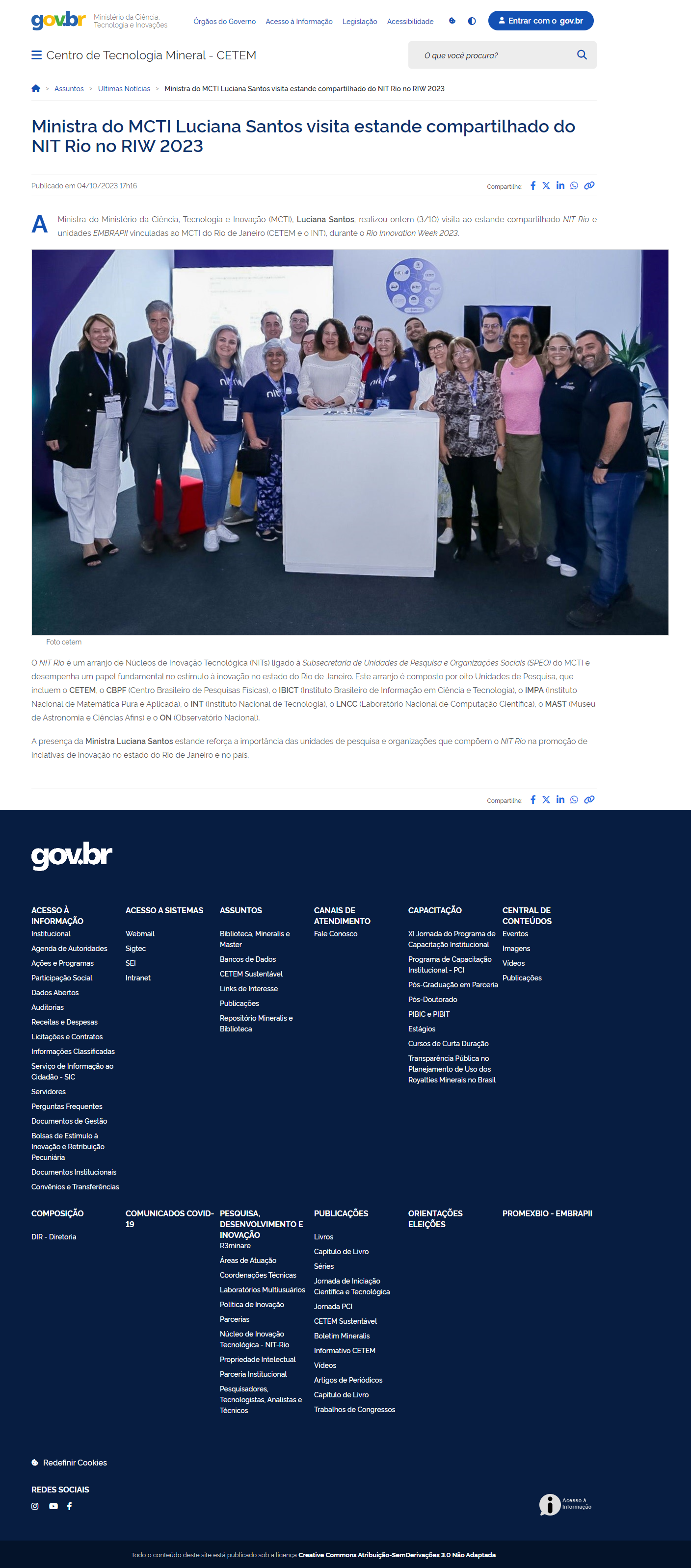 Centro de Tecnologia Mineral (CETEM) - Ministra do MCTI Luciana Santos visita estande compartilhado do NIT Rio no RIW 2023