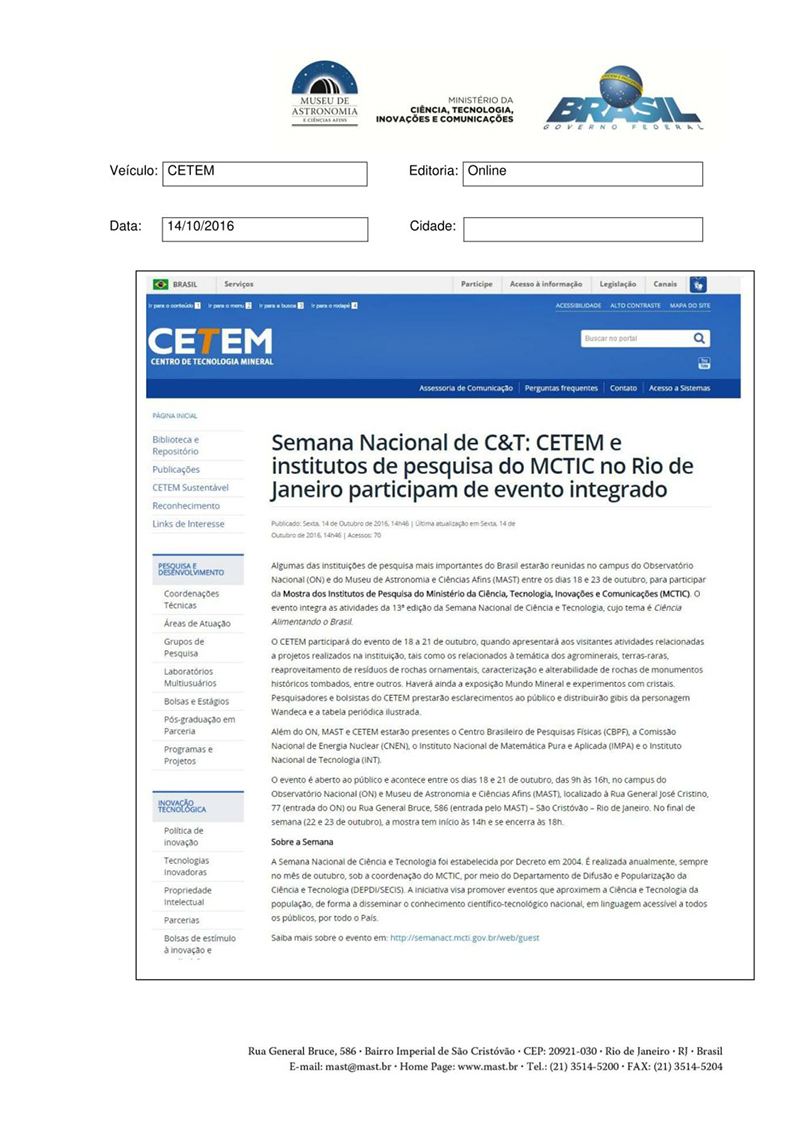 CETEM | Semana Nacional de C&T: CETEM e institutos de pesquisa do MCTIC no Rio de Janeiro participam de evento integrado