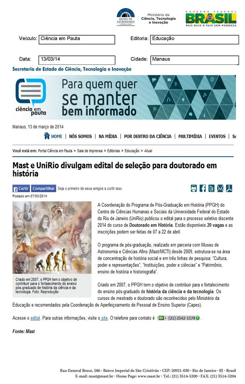Ciência em Pauta | MAST e UNIRIO divulgam edital do processo seletivo para doutorado em História