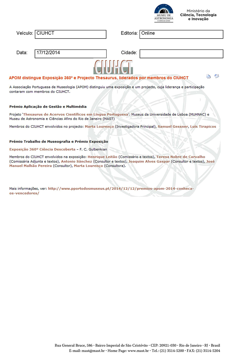 CIUHCT | APOM distingue Exposição 360° e projecto Thesaurus, liderados por membros do CIUHCT