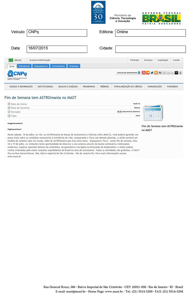 CNPq | Fim de Semana tem ASTROmania no MAST