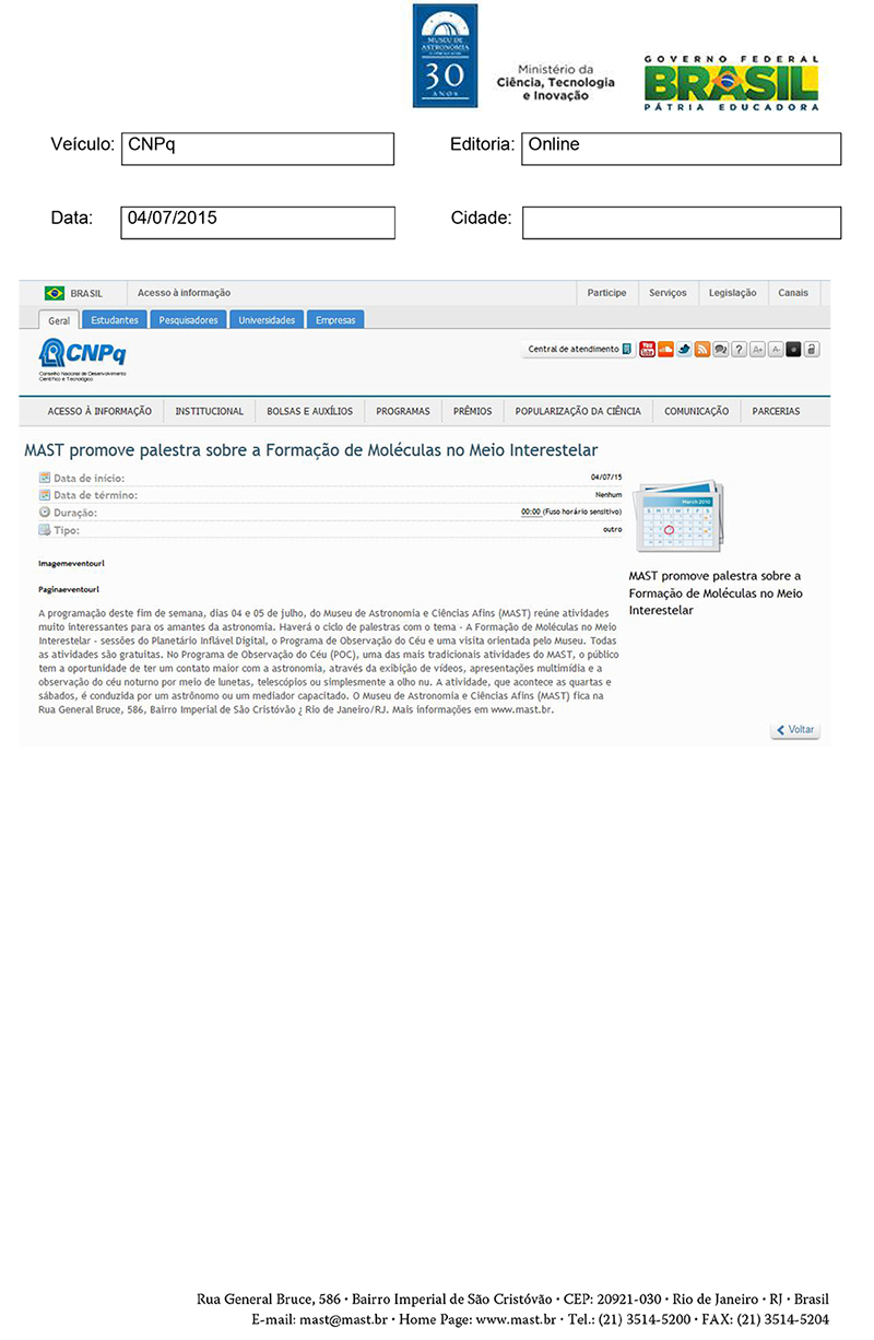 CNPq | MAST promove palestra sobre formação de moléculas no Meio Interestelar