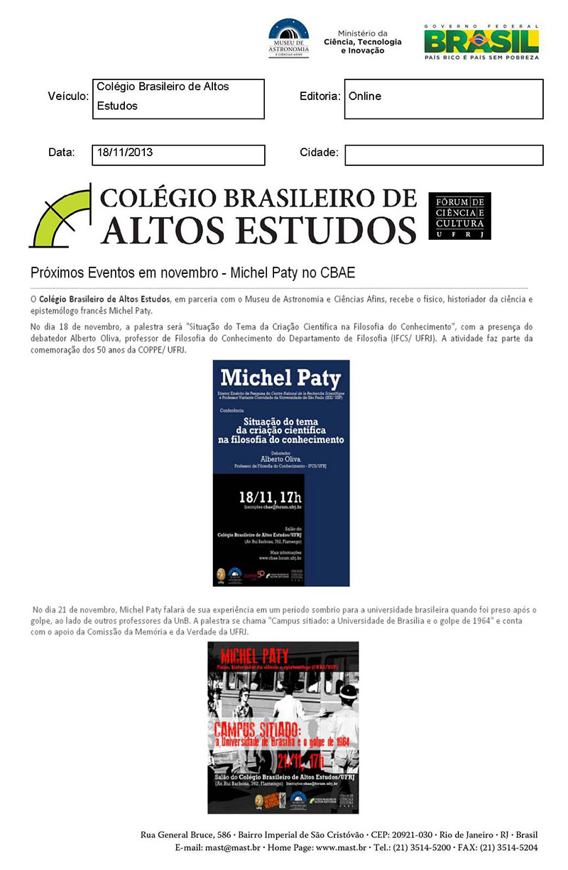 Colégio Brasileiro de Altos Estudos | Próximos eventos em novembro - Michel Paty no CBAE