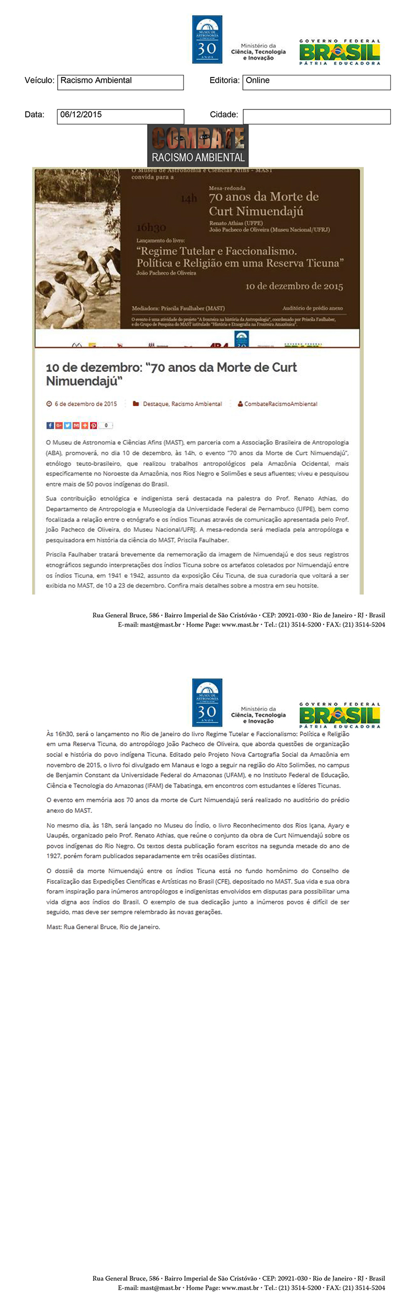 Combate Racismo Ambiental | 10 de dezembro: "70 anos da Morte de Curt Nimuendajú"