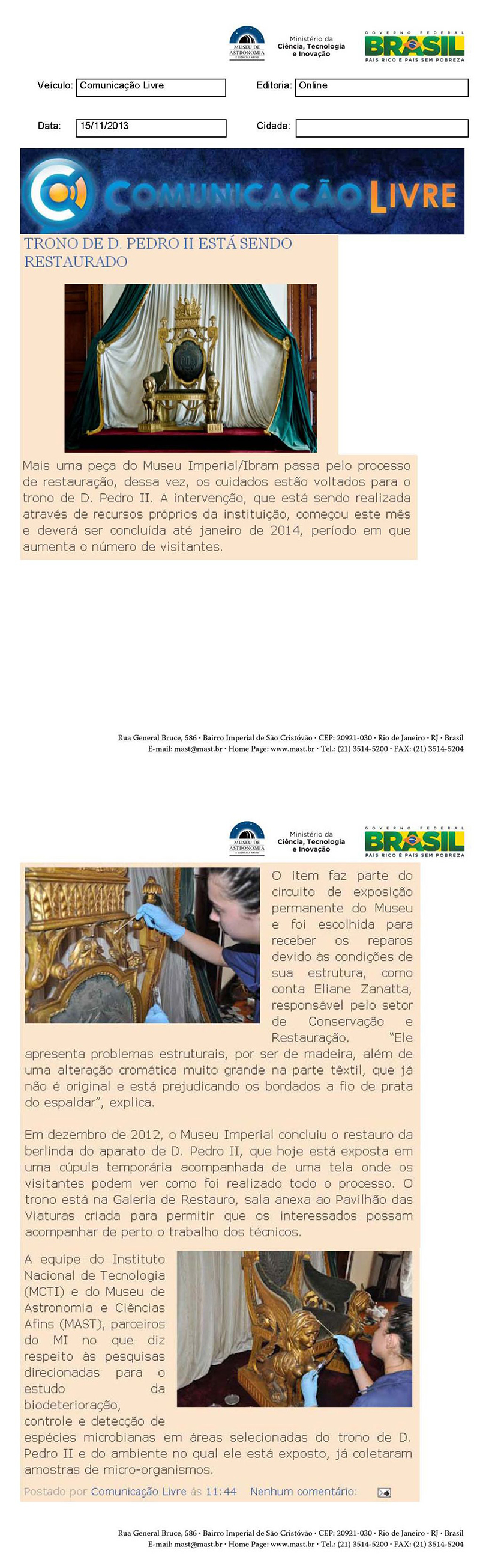 Comunicação Livre | Trono de D. Pedro II está sendo restaurado