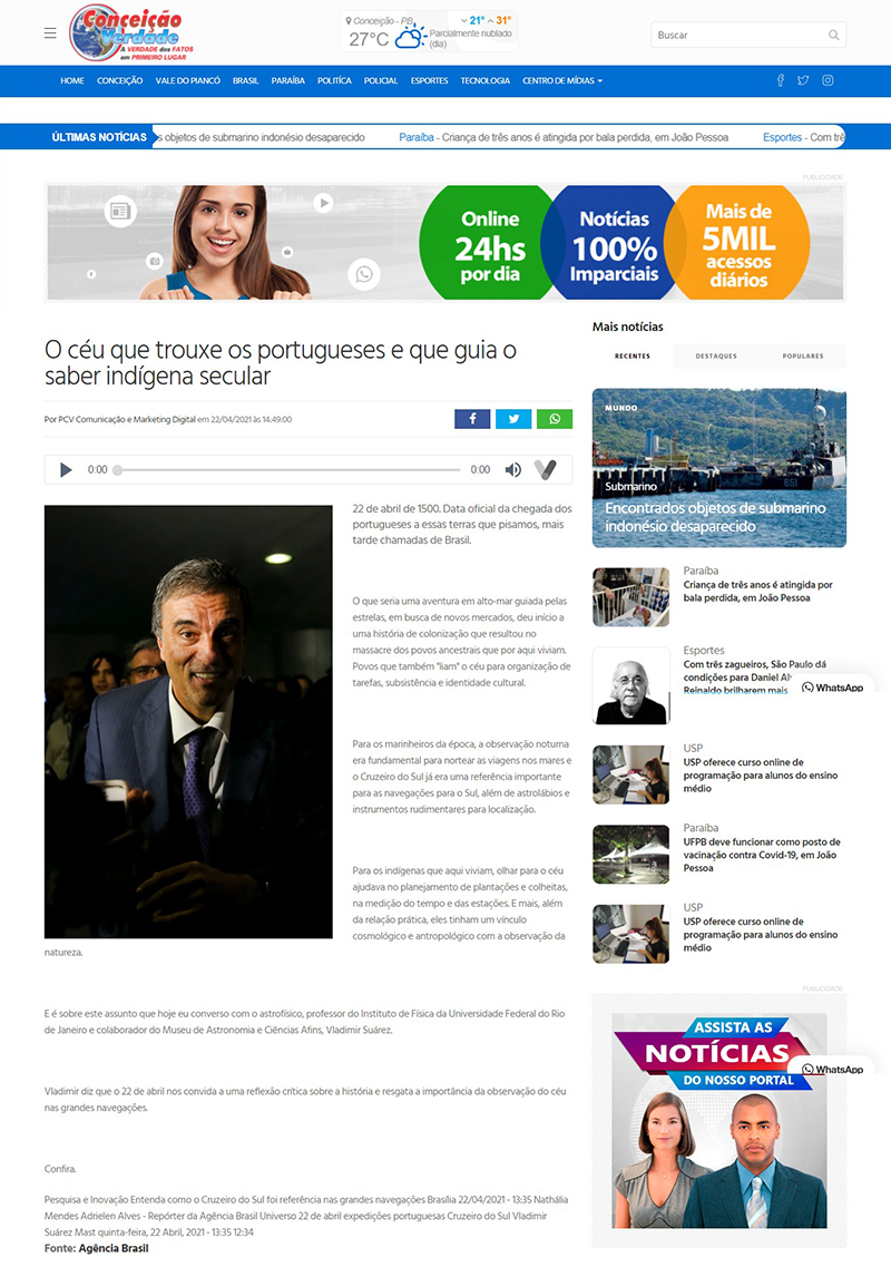 Conceição Verdade (site Conceição-PB) | MAST na reportagem 'O céu que trouxe os portugueses e que guia o saber indígena secular'