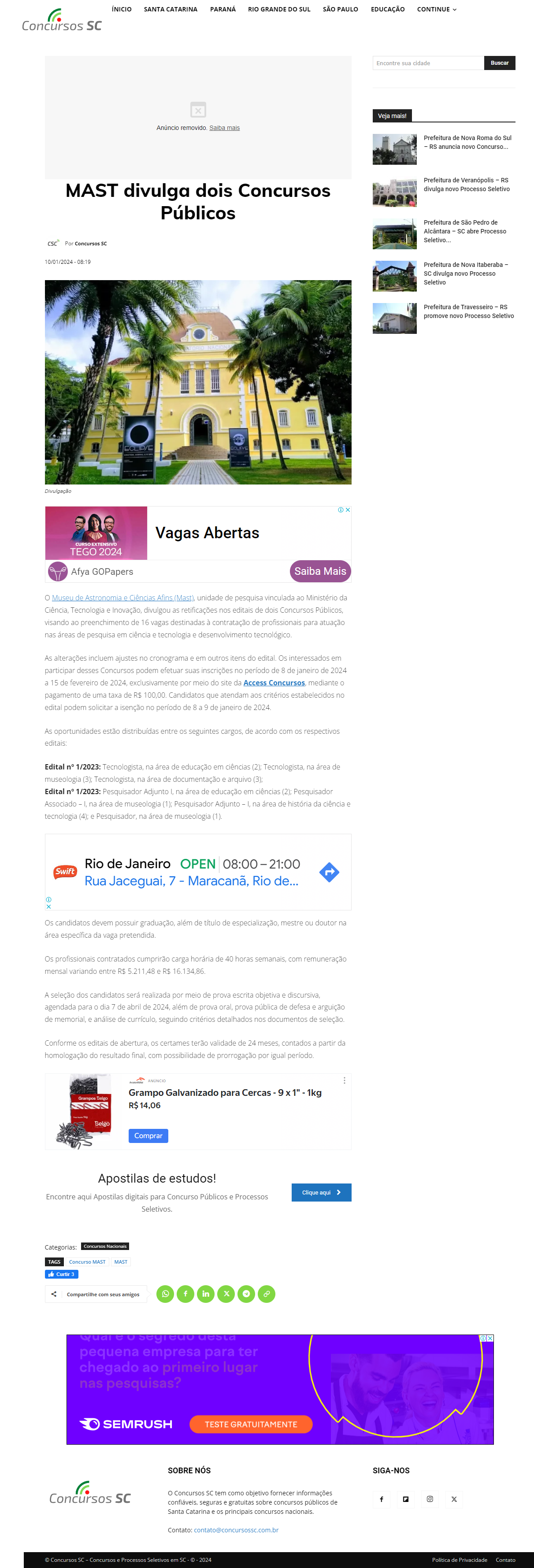 Concursos SC - MAST divulga dois Concursos Públicos