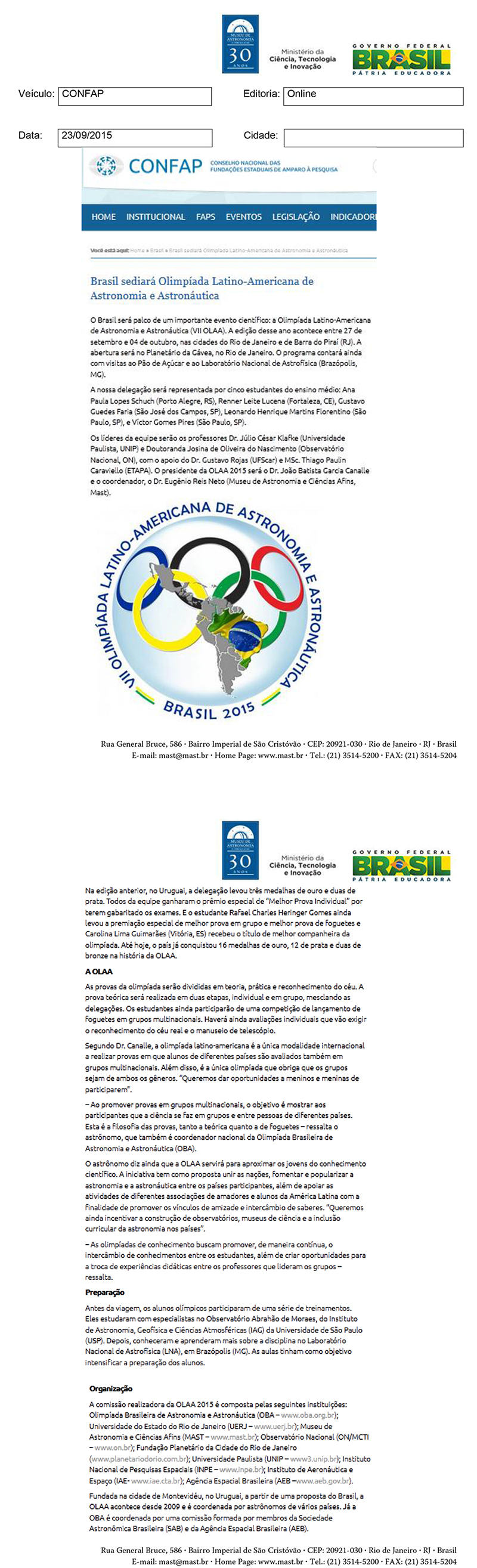 CONFAP | Brasil sediará Olimpíada Latino-Americana de Astronomia e Astronáutica