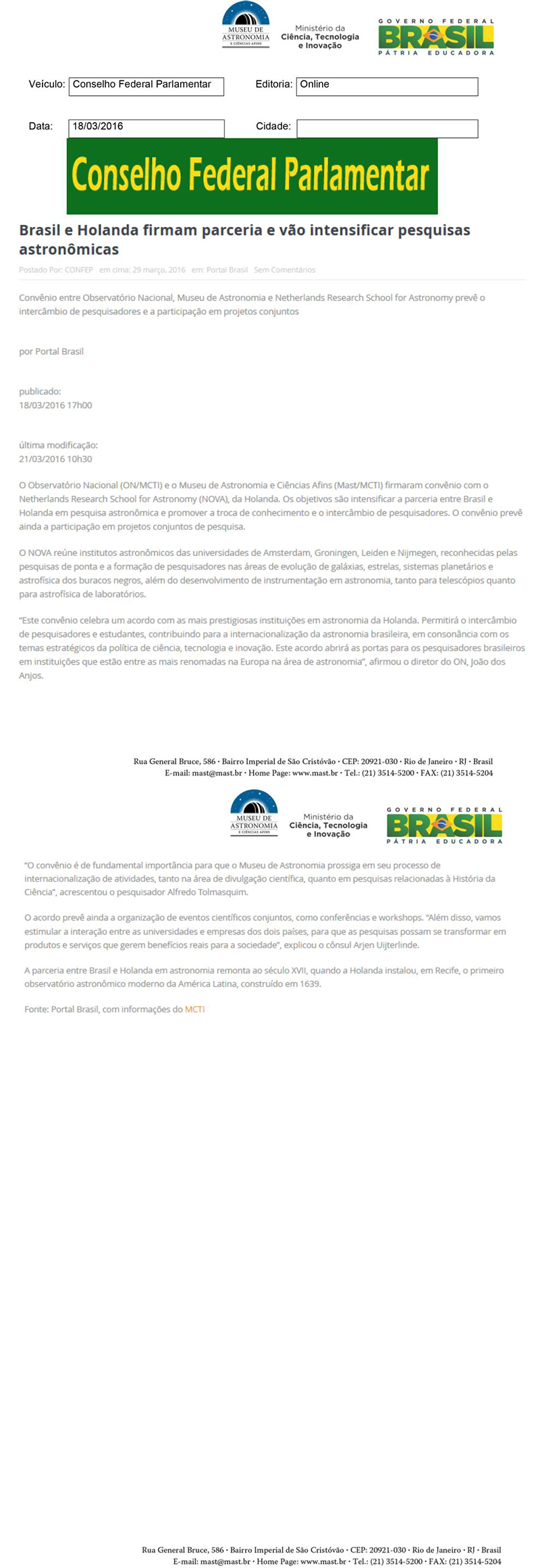 Conselho Federal Parlamentar | Brasil e Holanda firmam parceria e vão intensificar pesquisas astronômicas