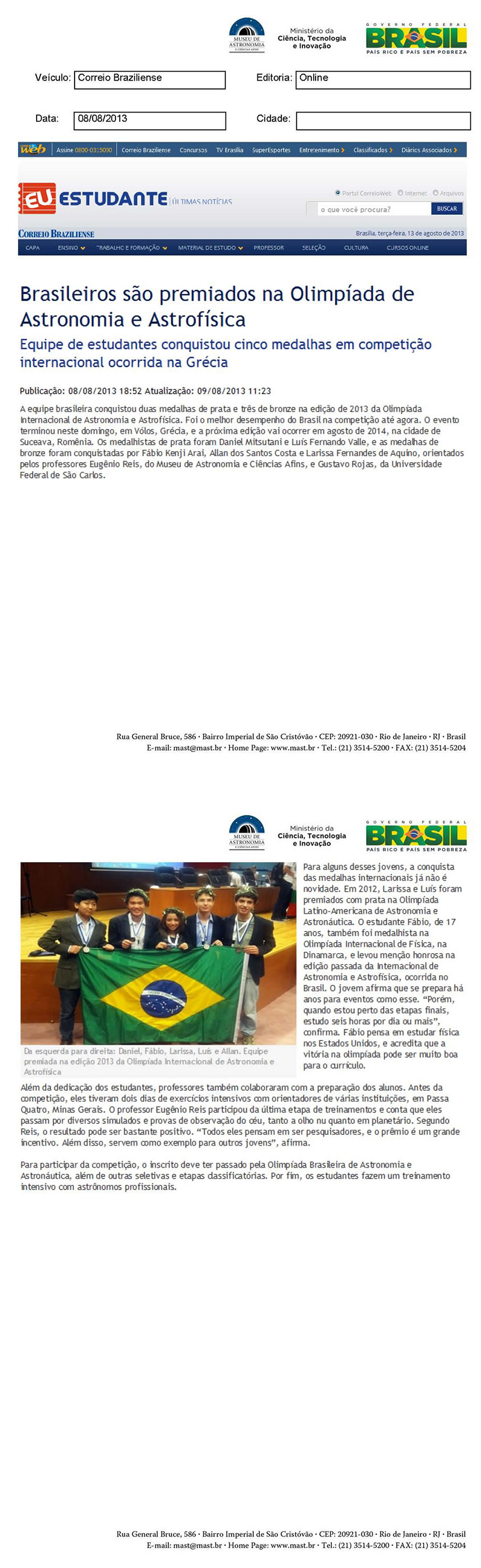 Correio Braziliense | Brasileiros são premiados na Olimpíada de Astronomia e Astrofísica