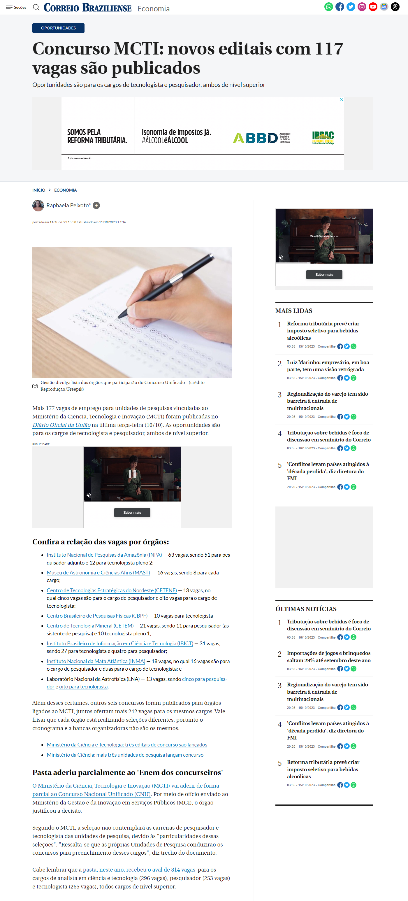 Correio Braziliense - Concurso MCTI: novos editais com 117 vagas são publicados
