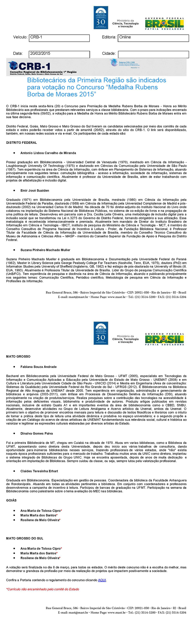 CRB-1 | Bibliotecários par Primeira Região são indicados para votação no Concurso "Medalha Rubens Borba de Moraes 2015"