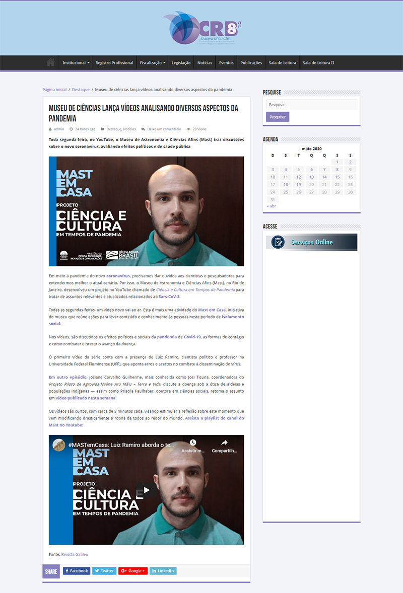 CRB-8 | Conselho Regional de Biblioteconomia do Estado de São Paulo / 8ª Região | MAST lança série de vídeos ‘Ciência e Cultura em Tempos de Pandemia’