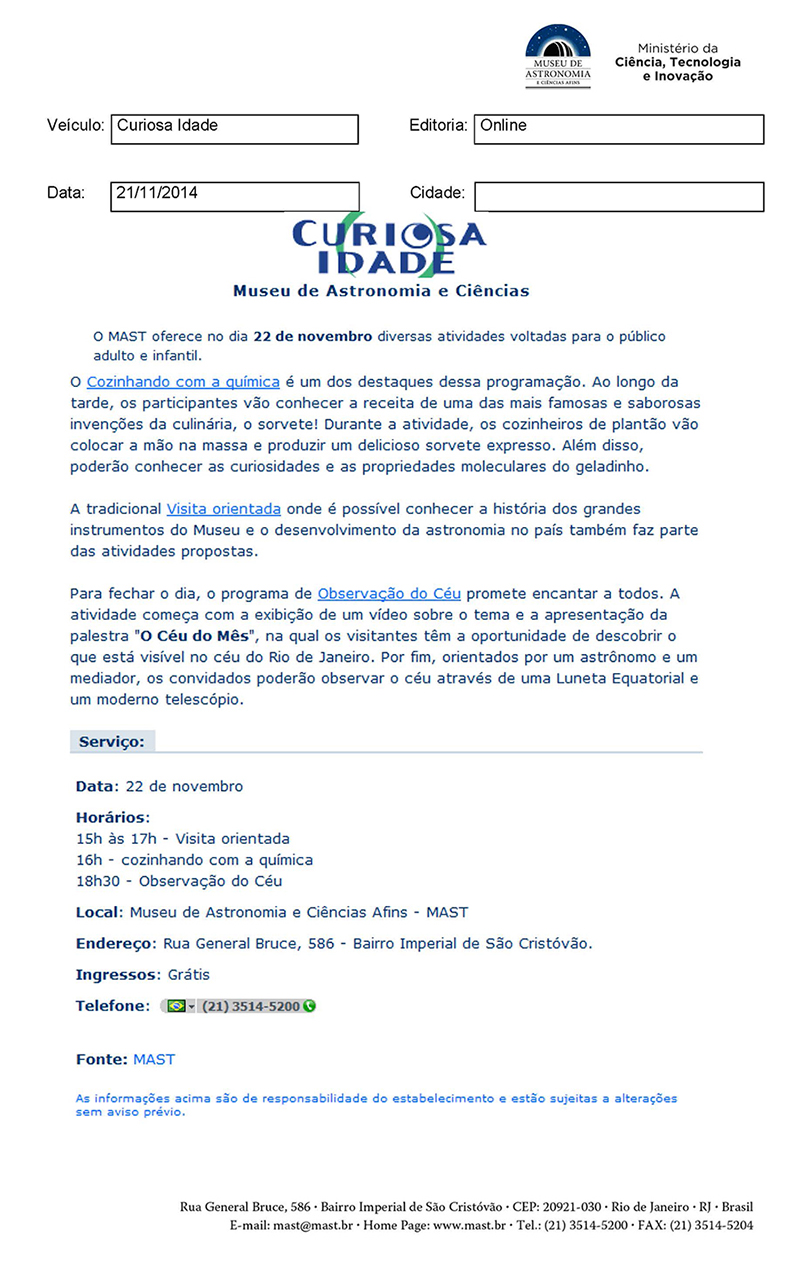 Curiosa Idade | O MAST oferece no dia 21 de novembro diversas atividades voltadas para o público adulto e infantil