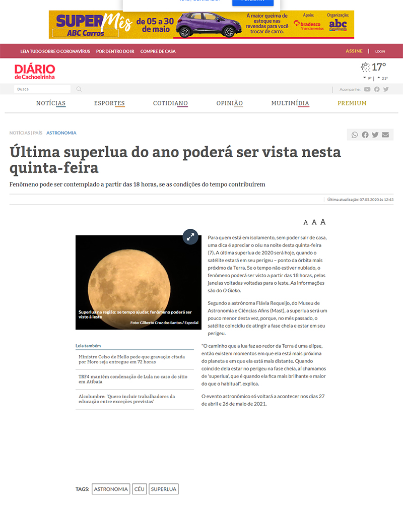 Diário de Cachoeirinha online (Cachoeirinha-RS) | MAST na reportagem sobre a última Superlua de 2020