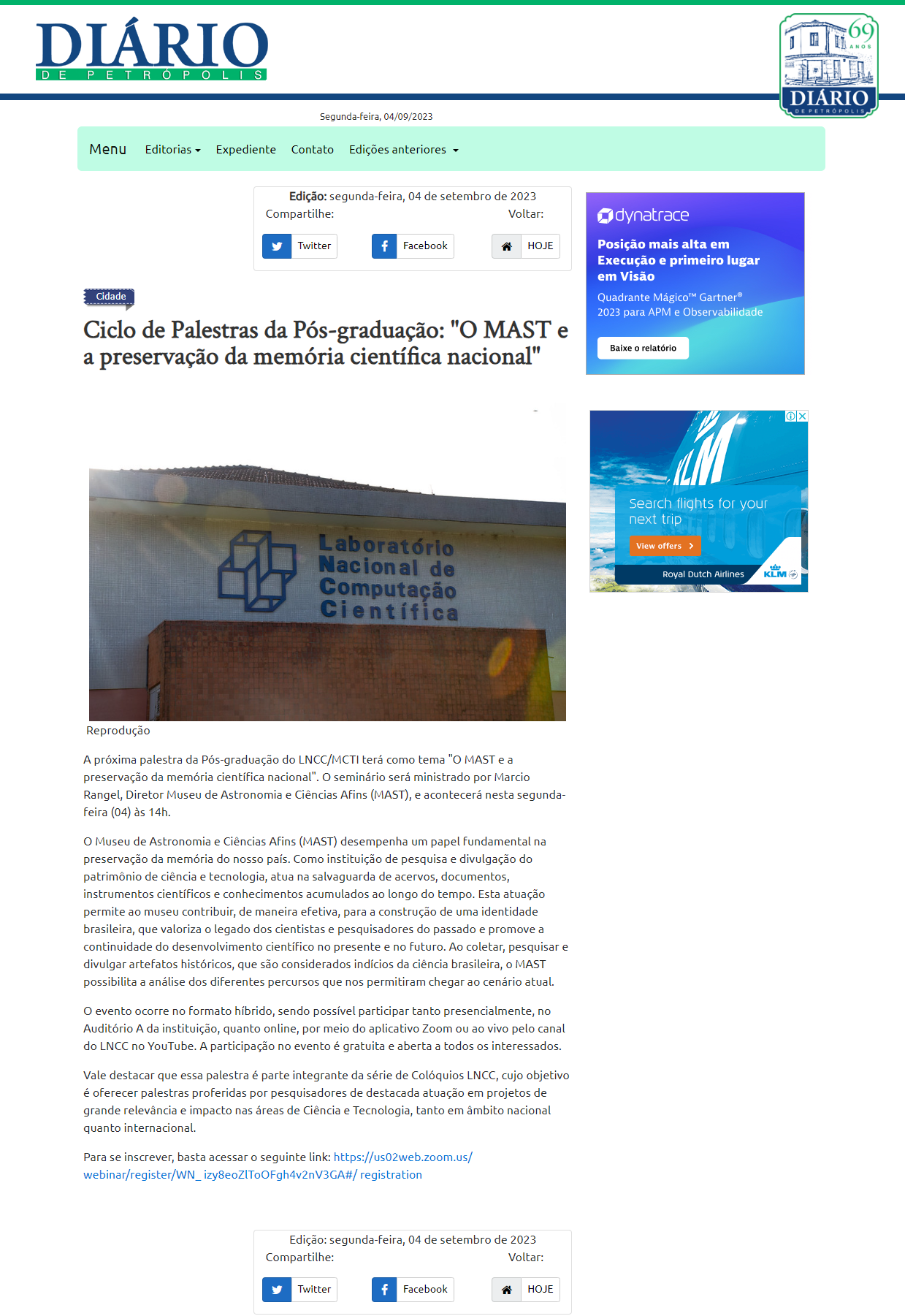 Diário de Petrópolis - Ciclo de Palestras da Pós-graduação: "O MAST e a preservação da memória científica nacional"