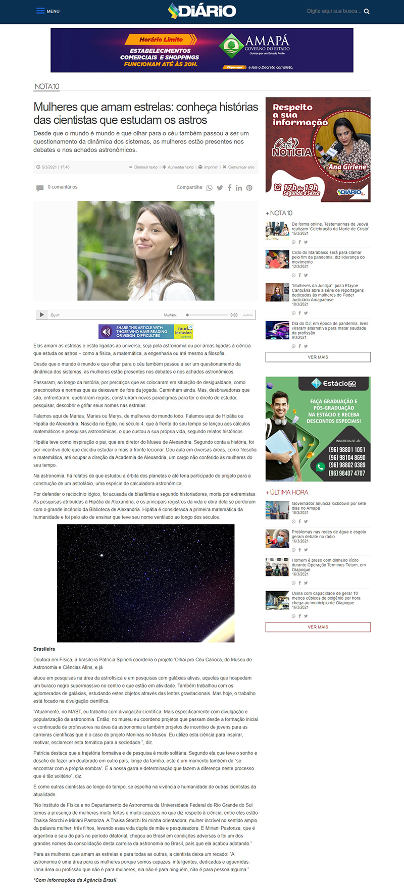 Diário do Amapá (Macapá-AP) | MAST na reportagem 'Conheça histórias de mulheres que, pelos séculos, estudam os astros'
