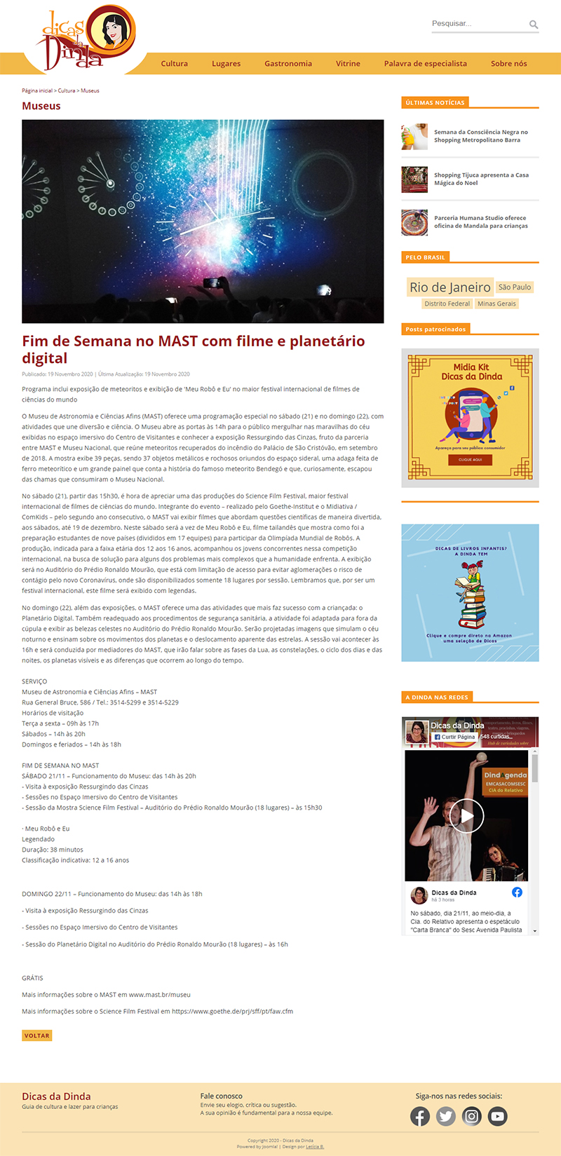 Dicas da Dinda | Fim de Semana no MAST com filme e planetário digital