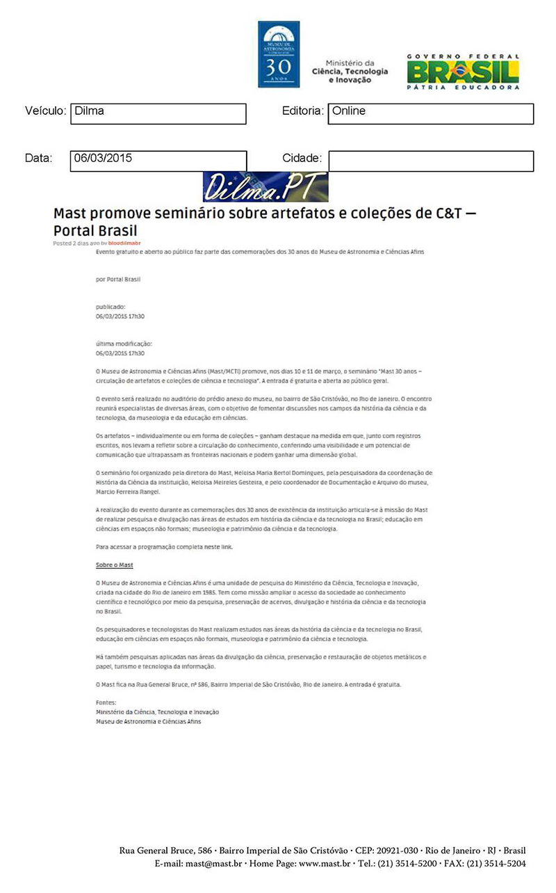 Dilma.PT | MAST promove seminário sobre artefatos e coleções de C&T