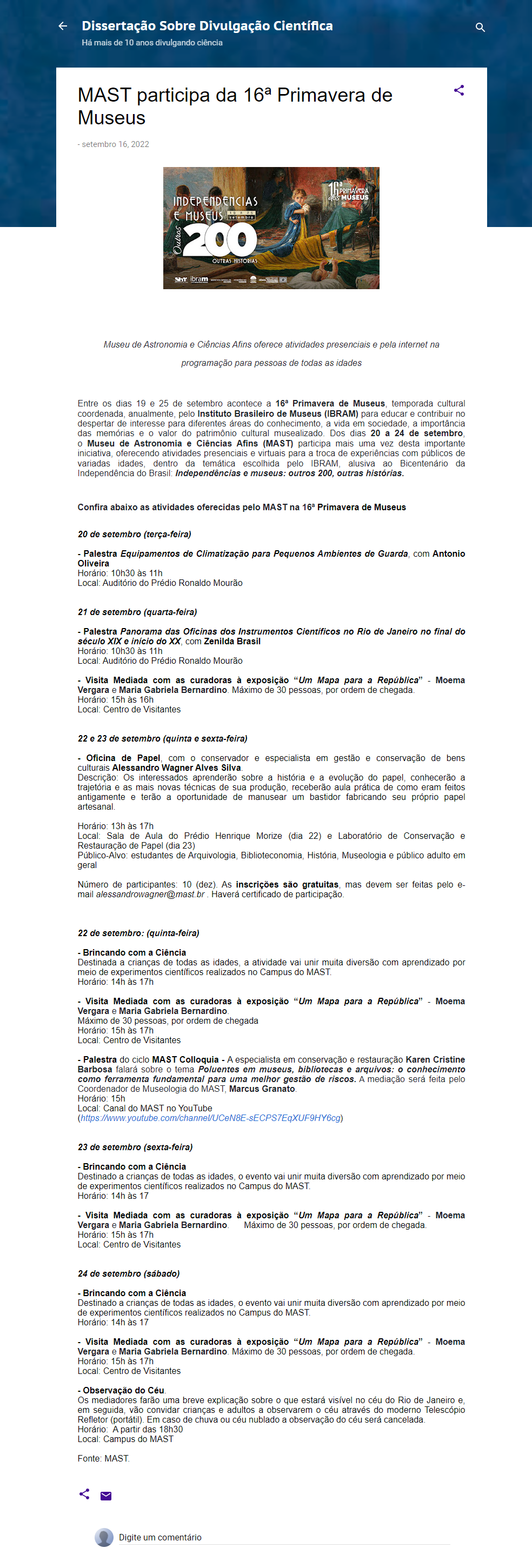 Dissertação Sobre Divulgação Científica (blogue) - MAST participa da 16ª Primavera de Museus