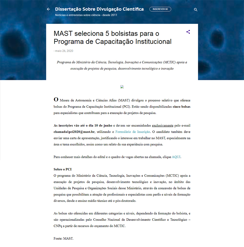 Dissertação Sobre Divulgação Científica (blogue) | MAST realiza seleção para bolsas no Programa de Capacitação Institucional – PCI